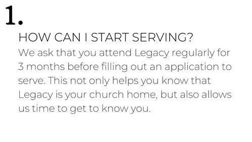At Legacy we consider serving the Lord and His people an honor and privilege. We would like to come alongside you, to help find your place to serve here at Legacy. Here are a few answers to the most frequently asked questions.