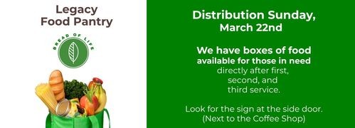 The Legacy Food Pantry will be distributing food boxes to those in need after each service this Sunday, March 22nd. Please visit the distribution table at the side door near the Coffee Shop.