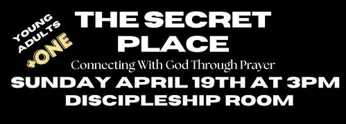 The Secret Place is a young adult gathering to experience His presence and grow in a real, personal way. Sunday, April 19th at 3pm in the discipleship room. Bring a friend!