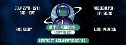 We are excited for VBS at Legacy this summer! If you have children/grandchildren Kindergarten – 5th grade, please plan on joining us July 25th – 27th from 9am-12pm at the church. This is a free event and lunch will be provided.